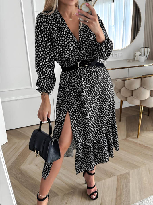 Zaprada mid-length V-neck dress with side slit and ruffles, elegant and casual, perfect for prom.