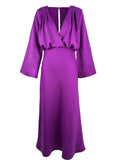 This dress comes in a beautiful shade of purple, showcasing a fashionable and noble temperament. The skirt design is simple and elegant, while the V-neck highlights the feminine neckline, adding a touch of sensuality and grace. The long trumpet sleeves are ideal for spring and autumn and offer extra warmth on cooler days. The metal ring detail at the waist adds a fashionable element while smartly defining the waistline to enhance the graceful silhouette. The polyester fabric is soft, breathable, and comfortable—perfect for all-day wear. The midi length is just right—not too conservative and not too revealing—making it suitable for various occasions such as daily outings, dates, or parties.