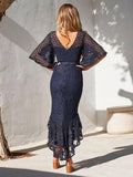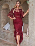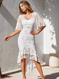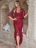 This dress is elegantly crafted with a blend of polyester and lace, delivering a refined and modern look. The high-low design adds sophistication and movement, with a short front and long back. The trumpet short sleeves and mermaid-style swallowtail hem provide a unique and elegant touch. Perfect for weddings, proms, or cocktail events, this dress is ideal for women seeking a look that is both stylish and relaxed. The lace fabric is soft, breathable, and comfortable—perfect for spring and summer seasons.